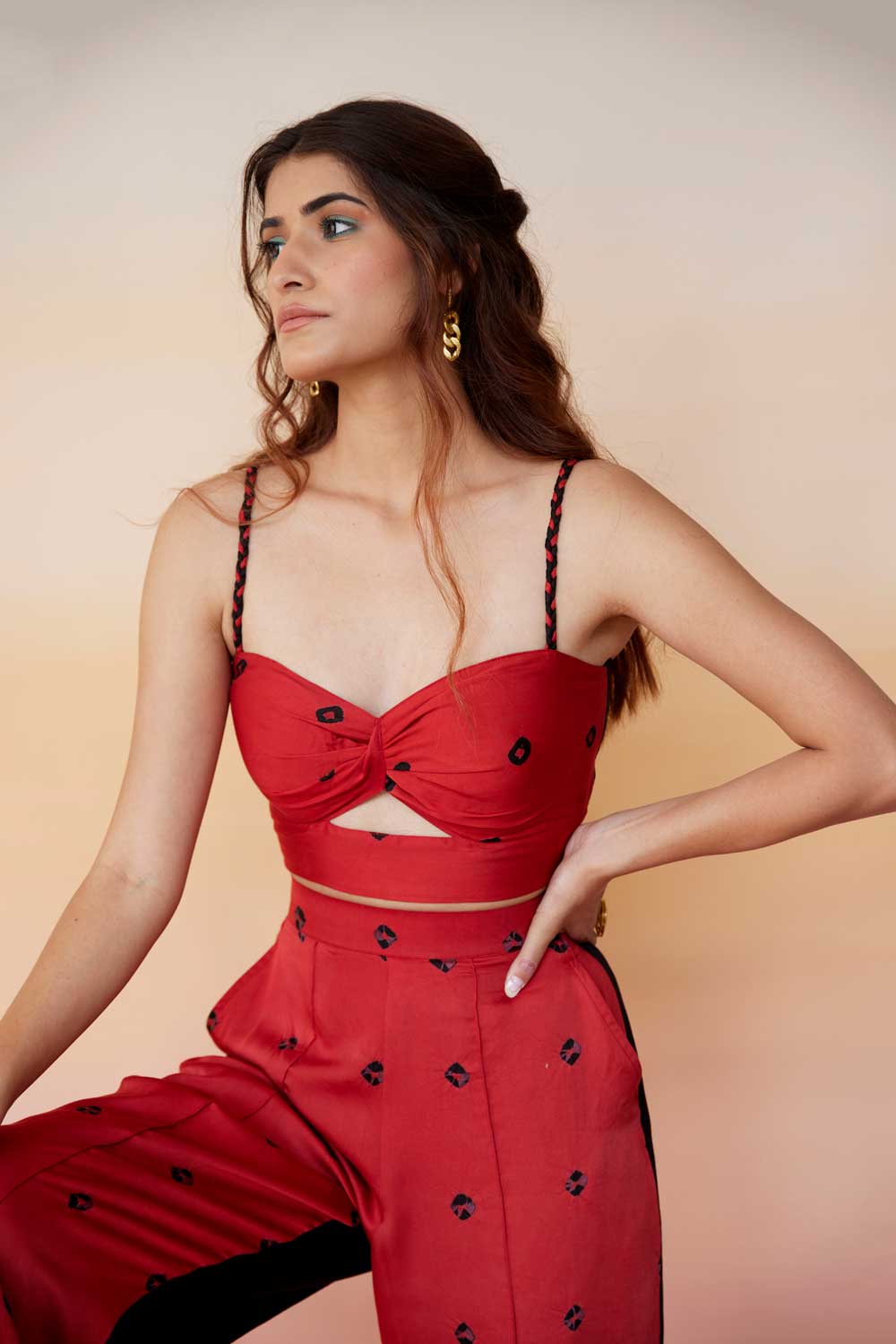 For bandhej, the fabric to be dyed is tied very tightly at different points and then dyed with extraordinary colours. These knots then don't let that part catch colour and allow it to stay as the base colour of the fabric.
