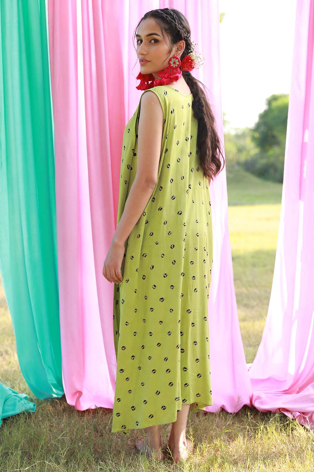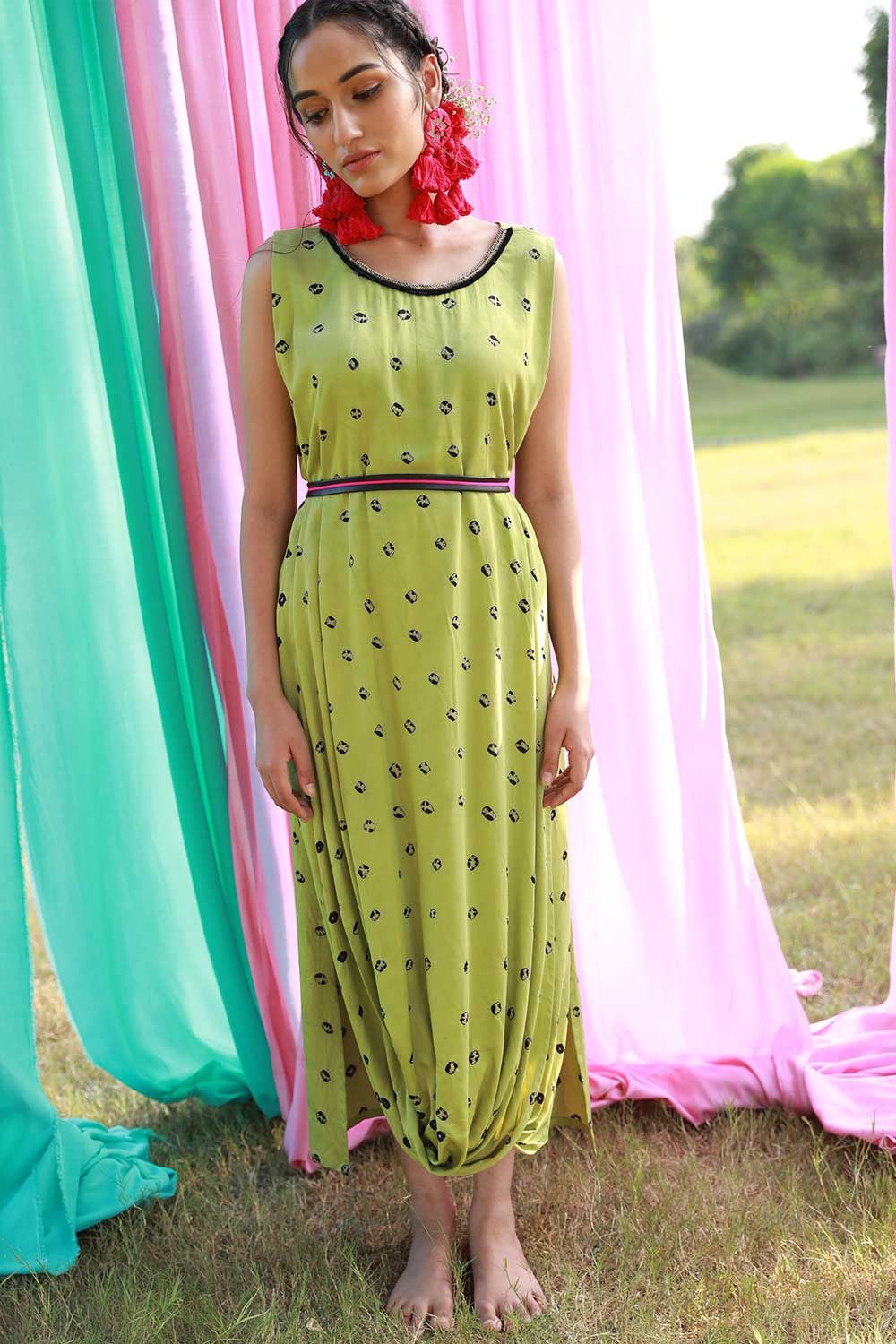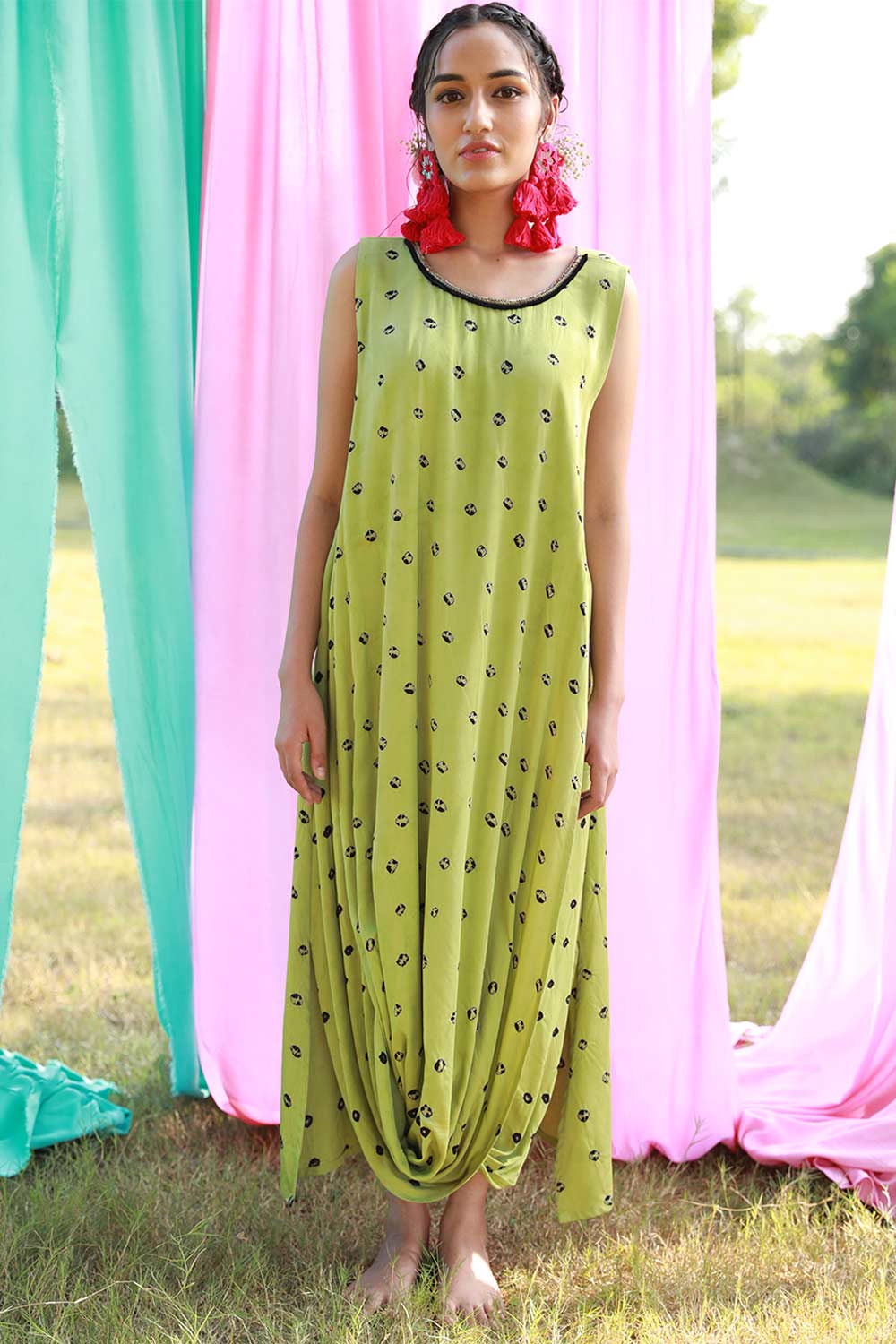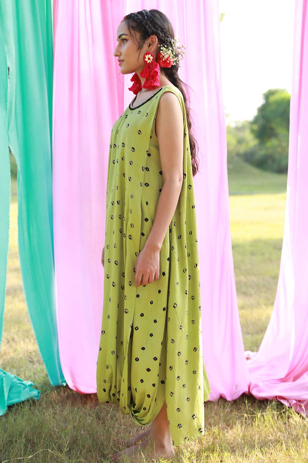 For bandhej, the fabric to be dyed is tied very tightly at different points and then dyed with extraordinary colours. These knots then don't let that part catch colour and allow it to stay as the base colour of the fabric.