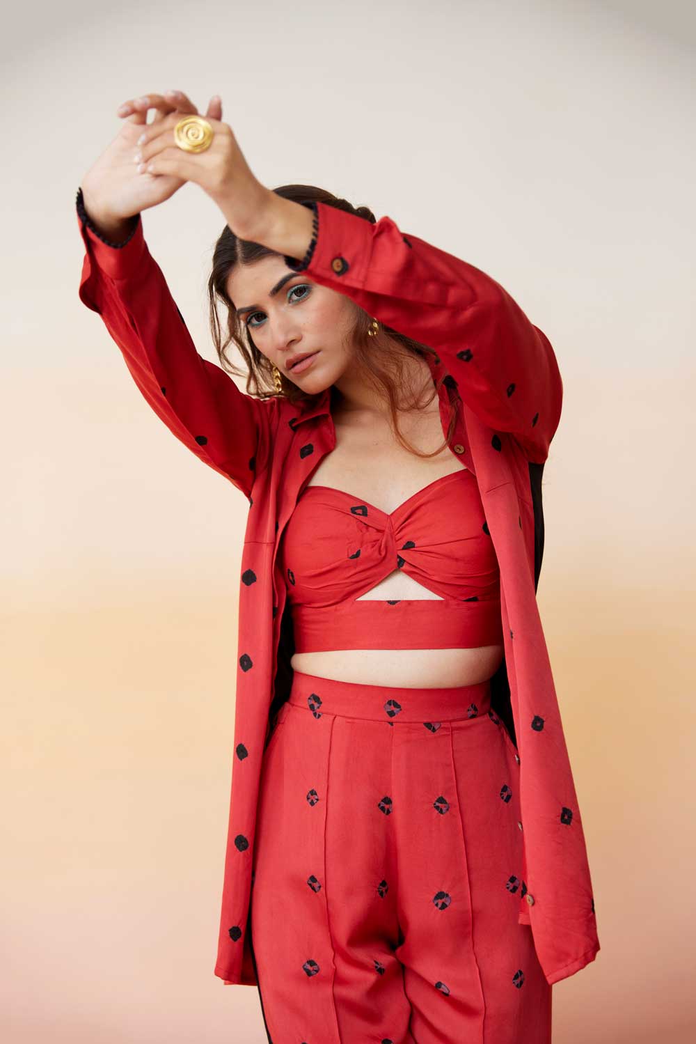 For bandhej, the fabric to be dyed is tied very tightly at different points and then dyed with extraordinary colours. These knots then don't let that part catch colour and allow it to stay as the base colour of the fabric.