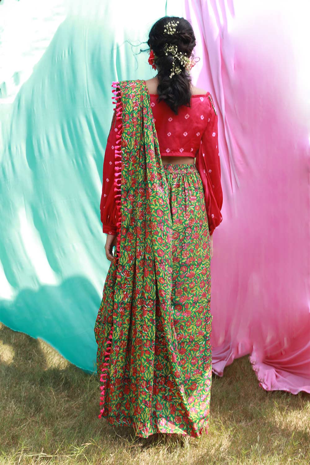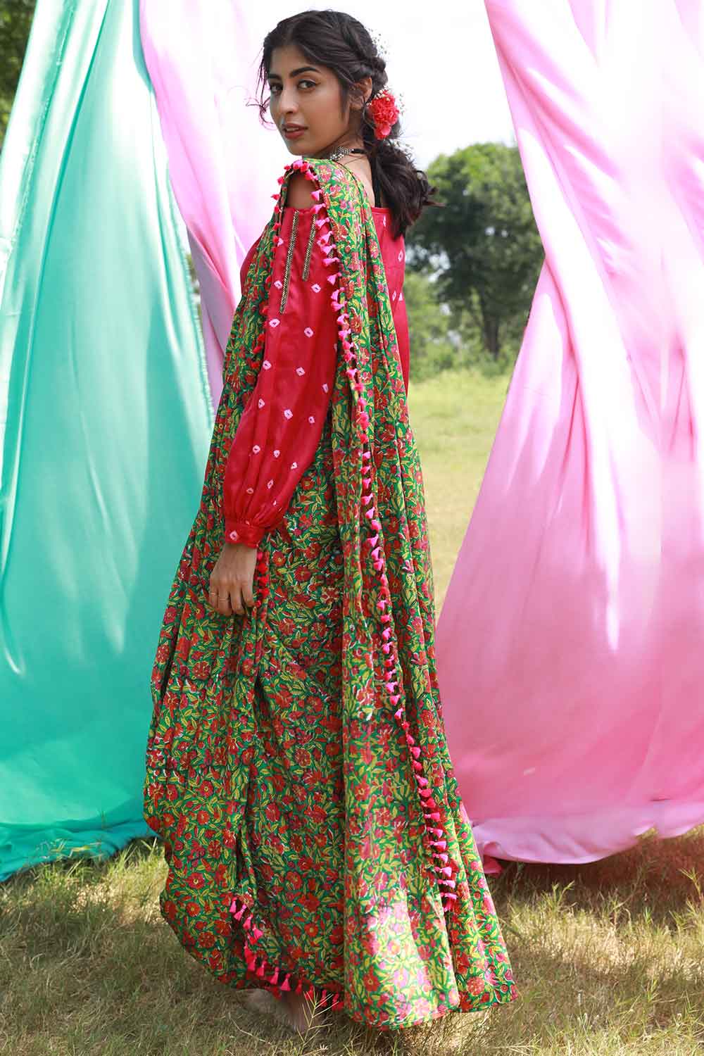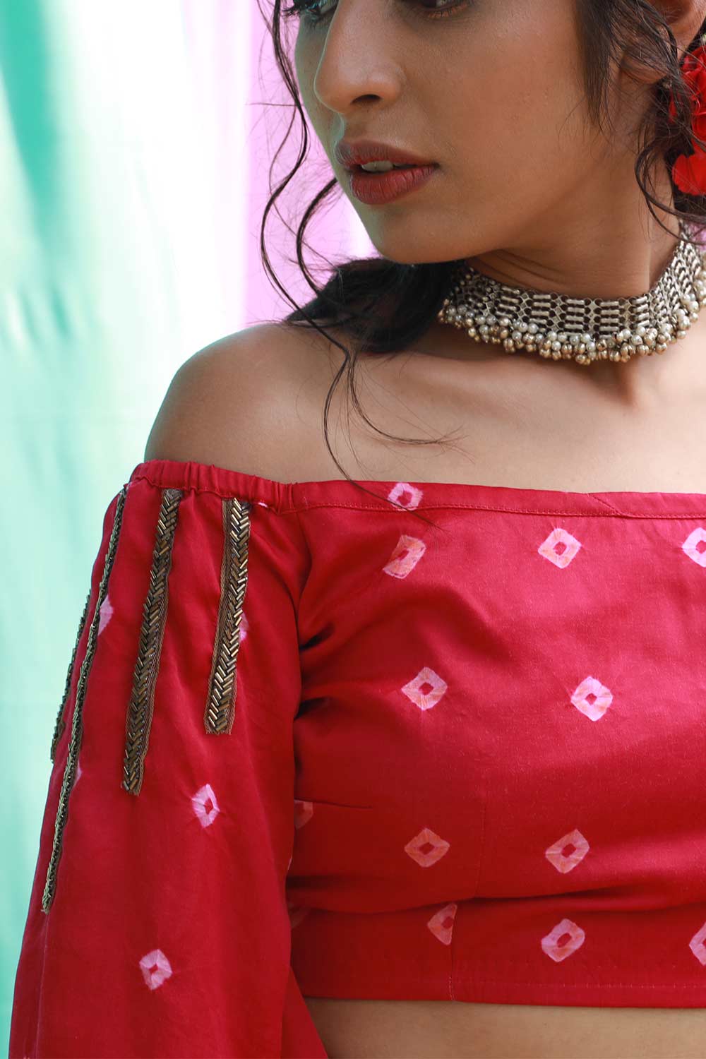 For bandhej, the fabric to be dyed is tied very tightly at different points and then dyed with extraordinary colours. These knots then don't let that part catch colour and allow it to stay as the base colour of the fabric.
