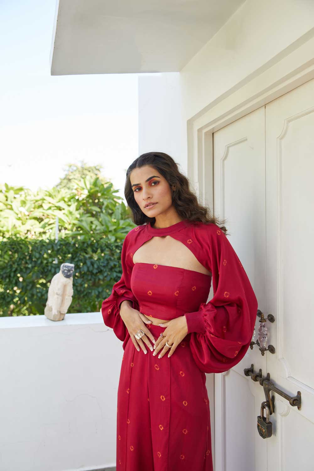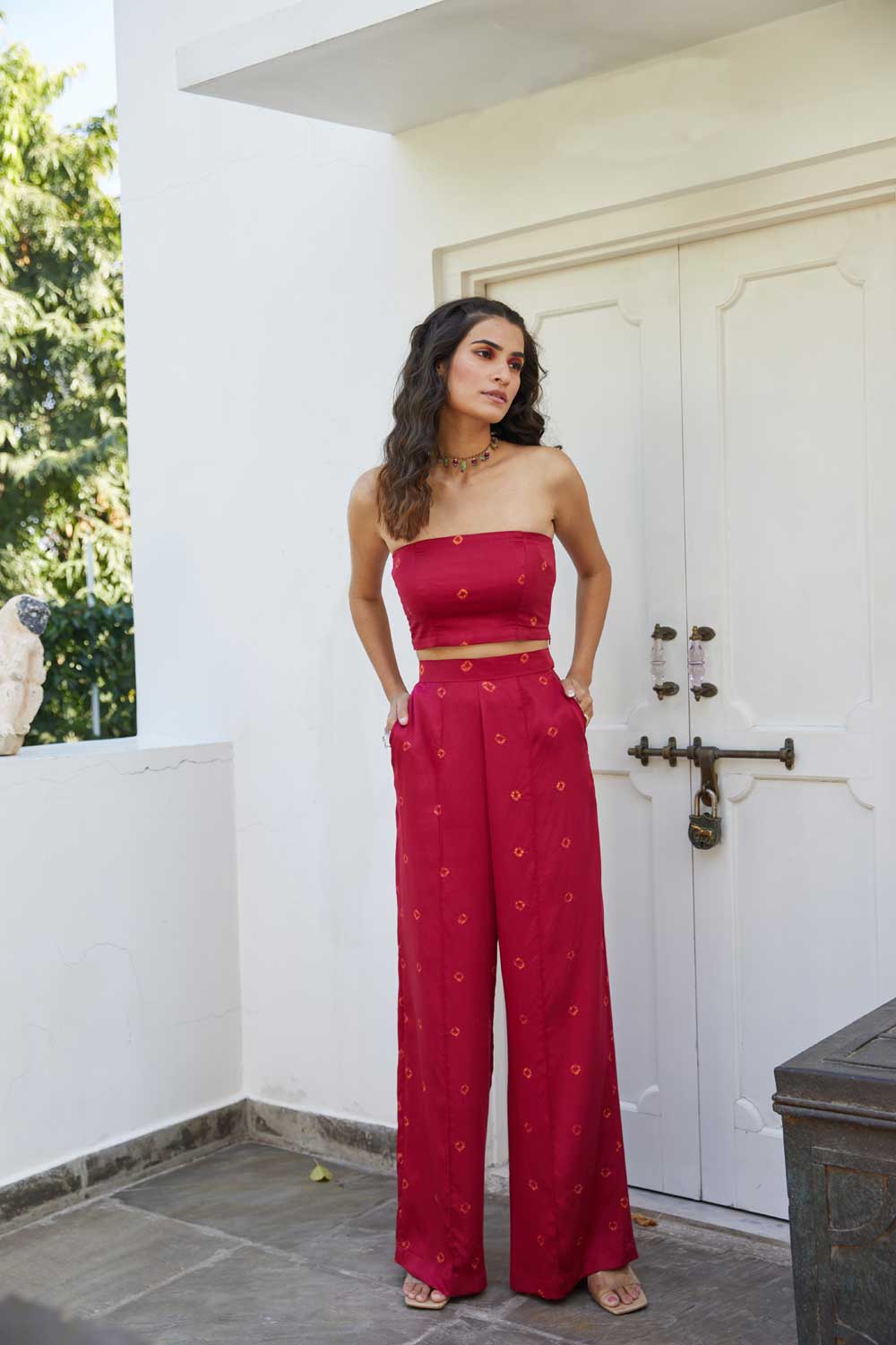 For bandhej, the fabric to be dyed is tied very tightly at different points and then dyed with extraordinary colours. These knots then don't let that part catch colour and allow it to stay as the base colour of the fabric.