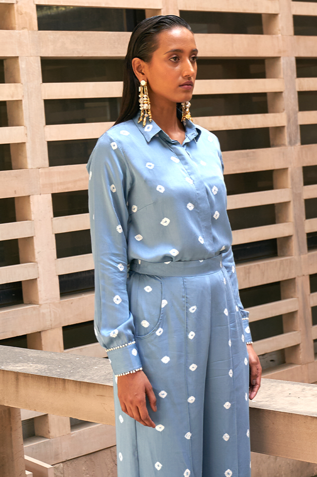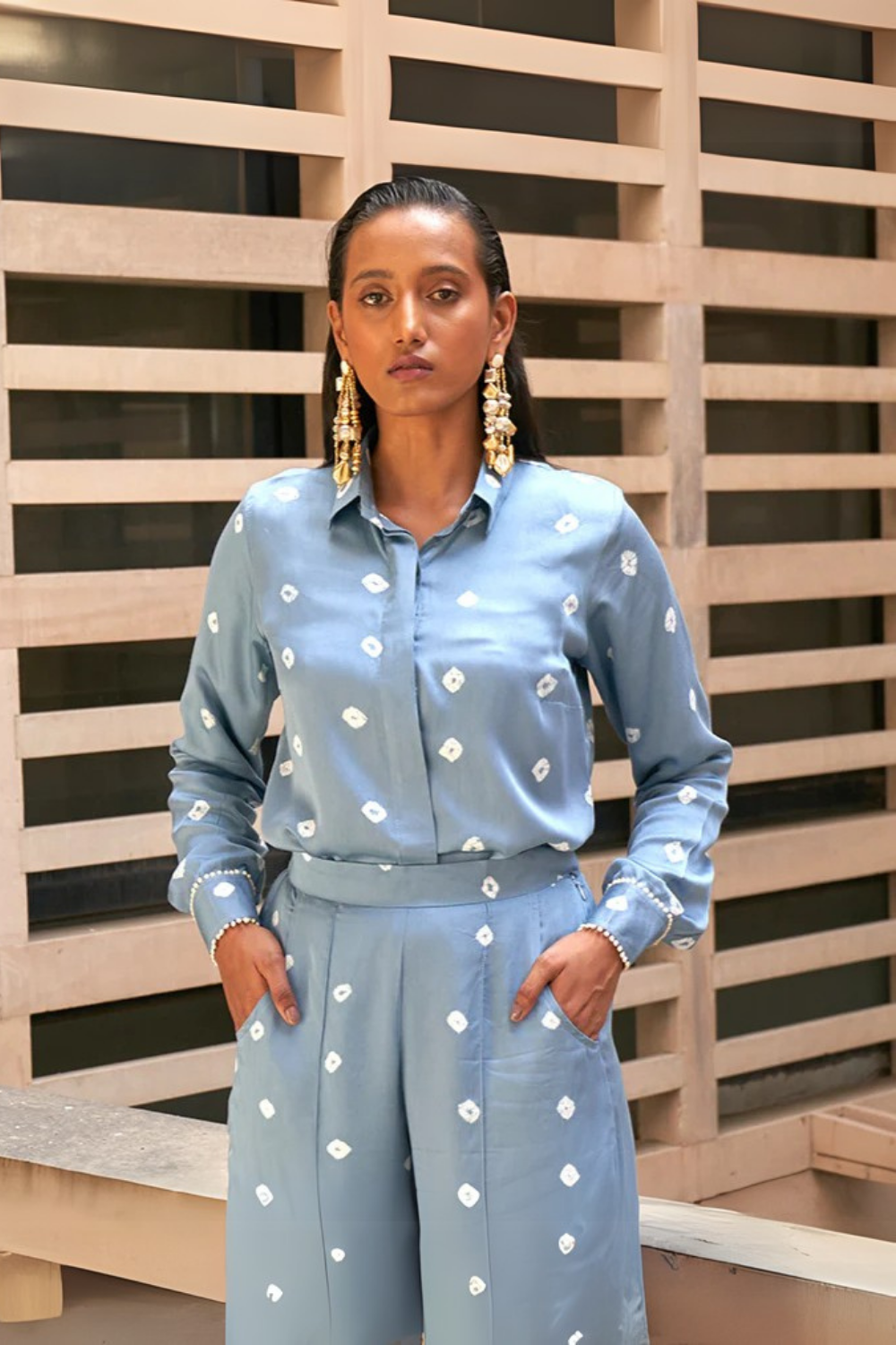 For bandhej, the fabric to be dyed is tied very tightly at different points and then dyed with extraordinary colours. These knots then don't let that part catch colour and allow it to stay as the base colour of the fabric.