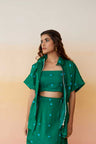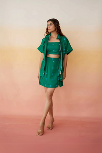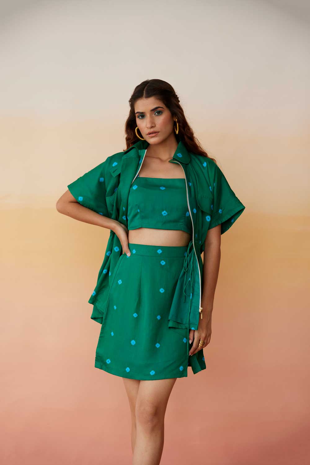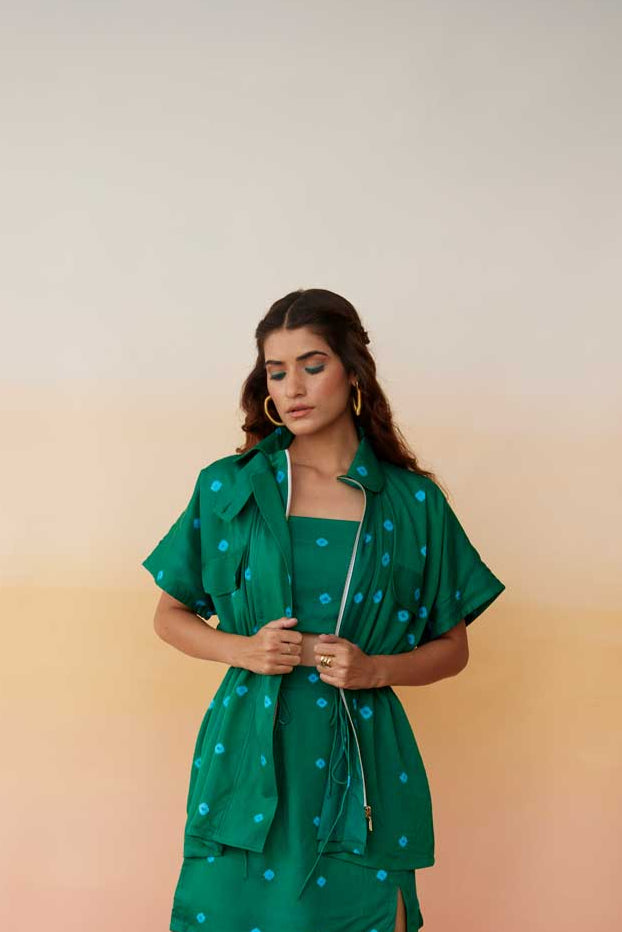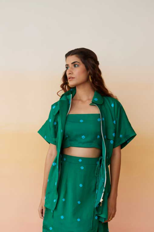 For bandhej, the fabric to be dyed is tied very tightly at different points and then dyed with extraordinary colours. These knots then don't let that part catch colour and allow it to stay as the base colour of the fabric.