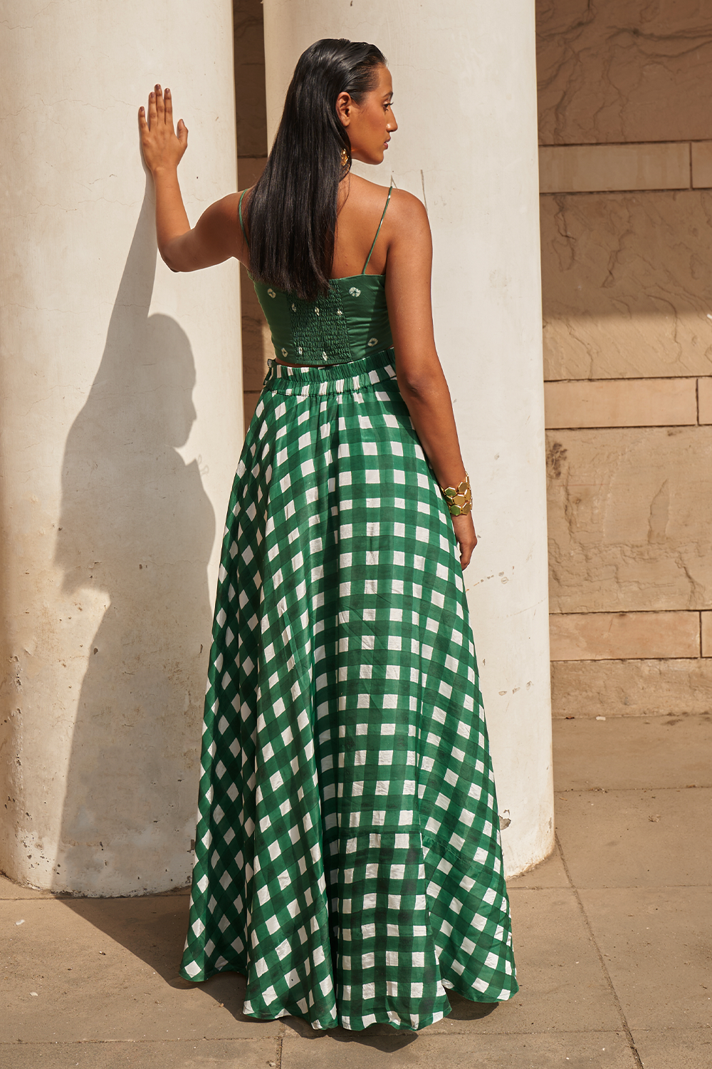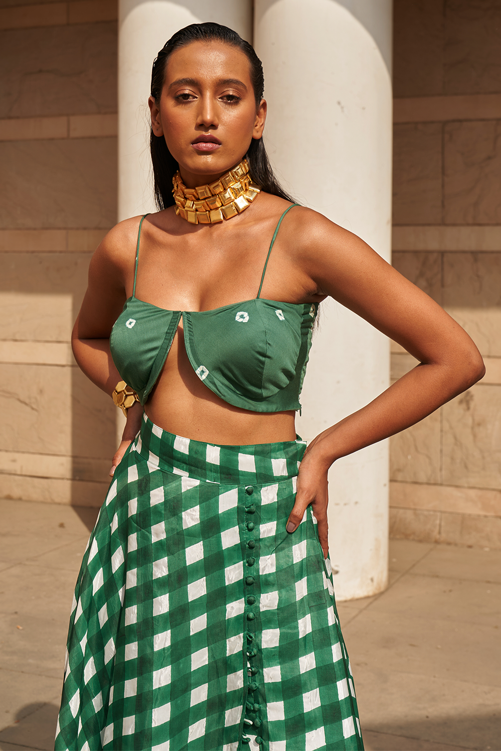 For bandhej, the fabric to be dyed is tied very tightly at different points and then dyed with extraordinary colours. These knots then don't let that part catch colour and allow it to stay as the base colour of the fabric.