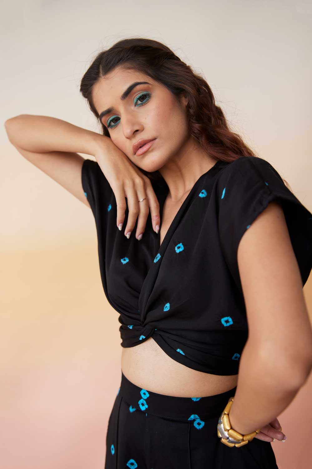 For bandhej, the fabric to be dyed is tied very tightly at different points and then dyed with extraordinary colours. These knots then don't let that part catch colour and allow it to stay as the base colour of the fabric.