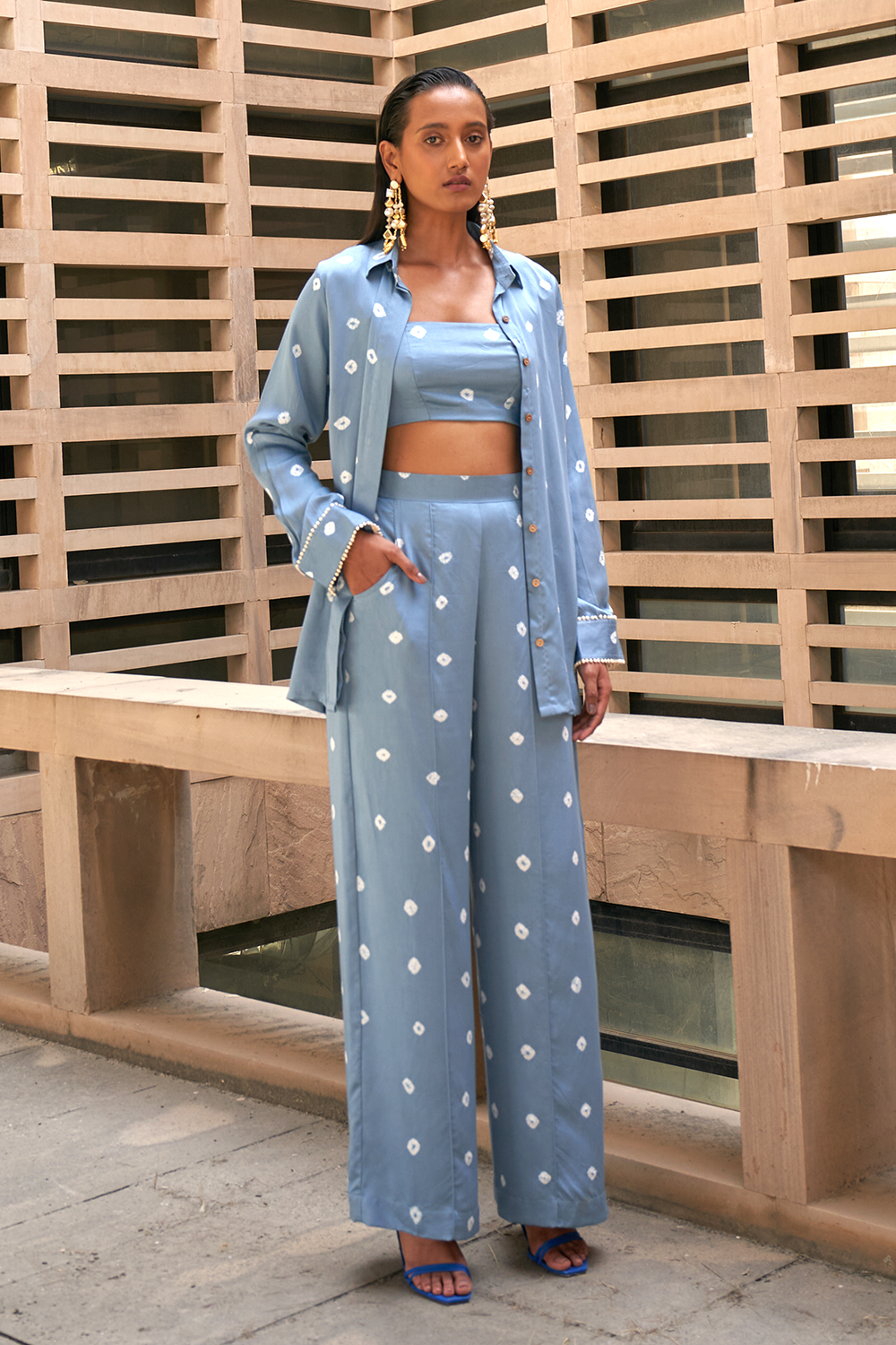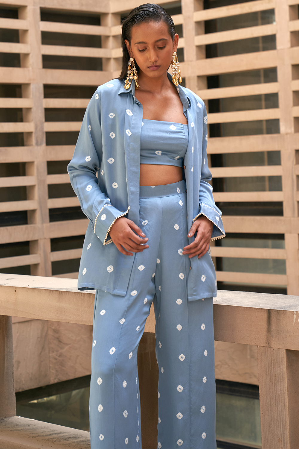 For bandhej, the fabric to be dyed is tied very tightly at different points and then dyed with extraordinary colours. These knots then don't let that part catch colour and allow it to stay as the base colour of the fabric.