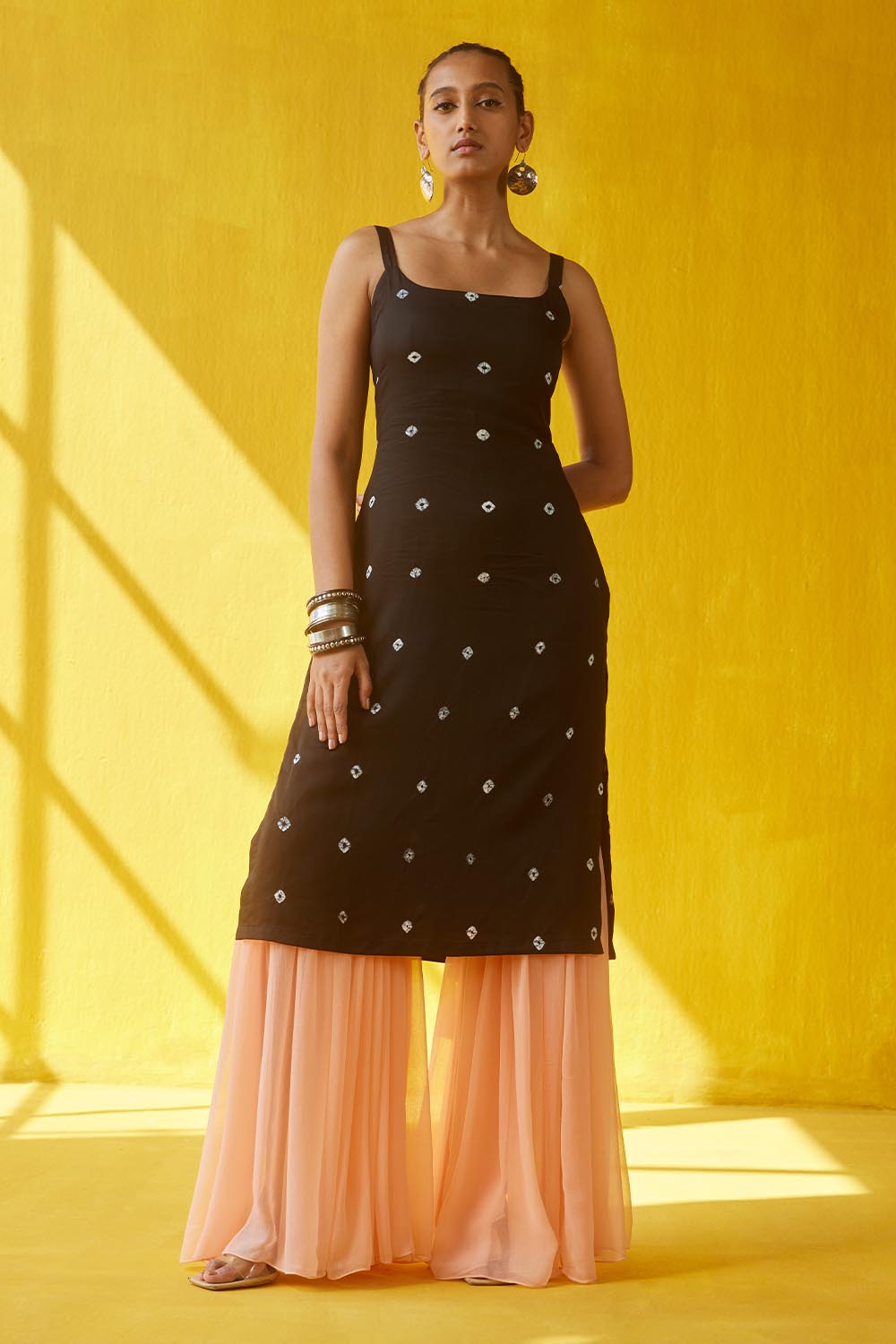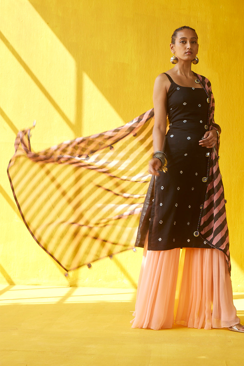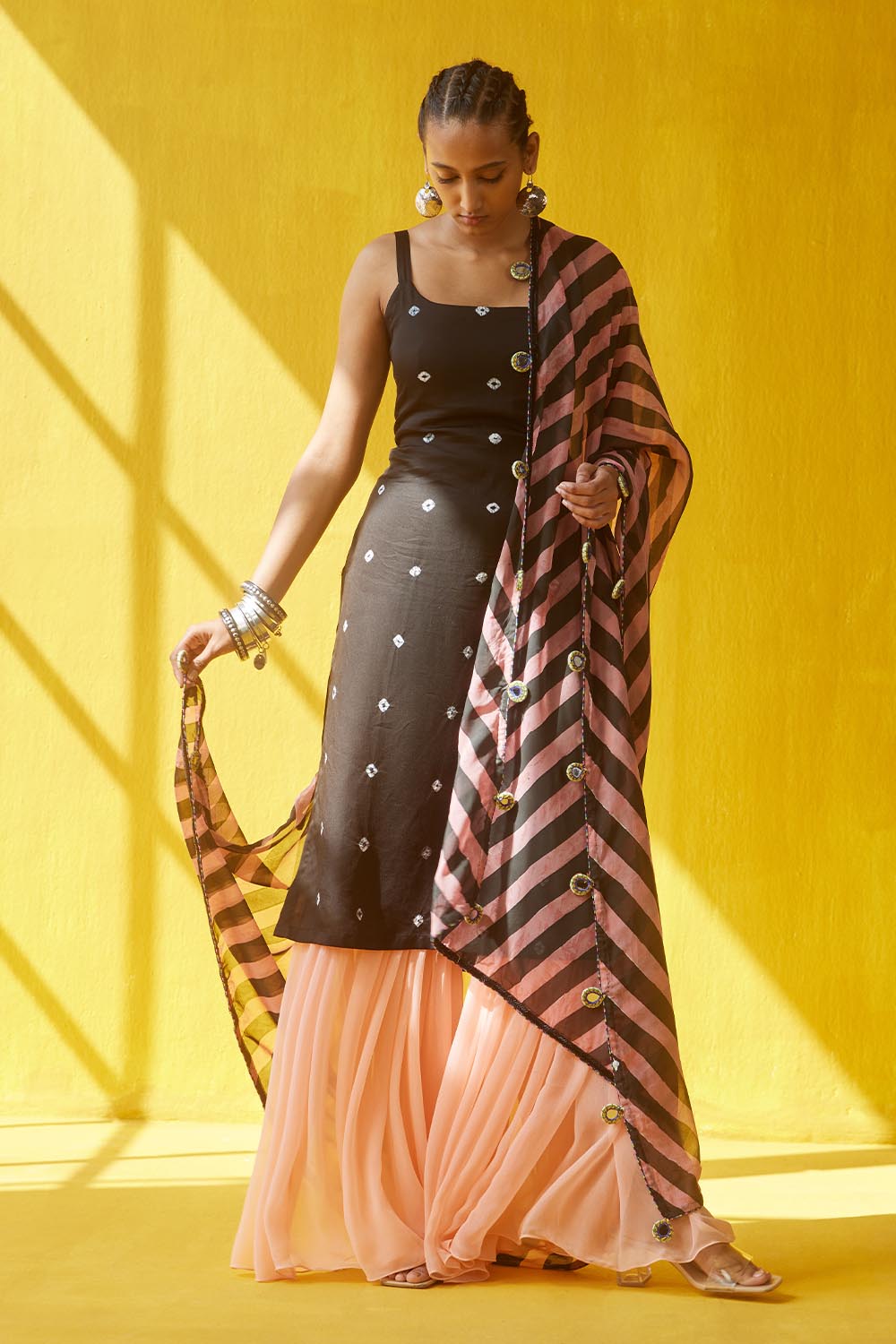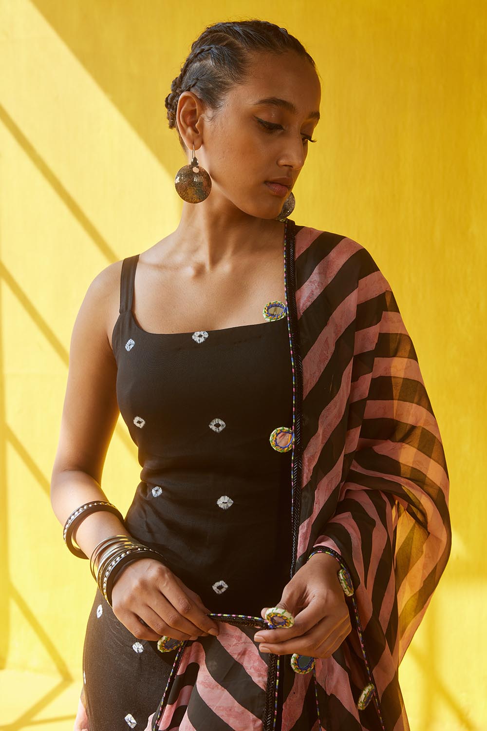 For bandhej, the fabric to be dyed is tied very tightly at different points and then dyed with extraordinary colours. These knots then don't let that part catch colour and allow it to stay as the base colour of the fabric.