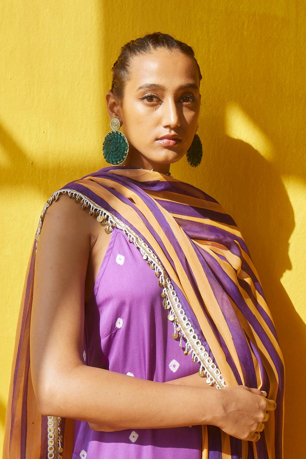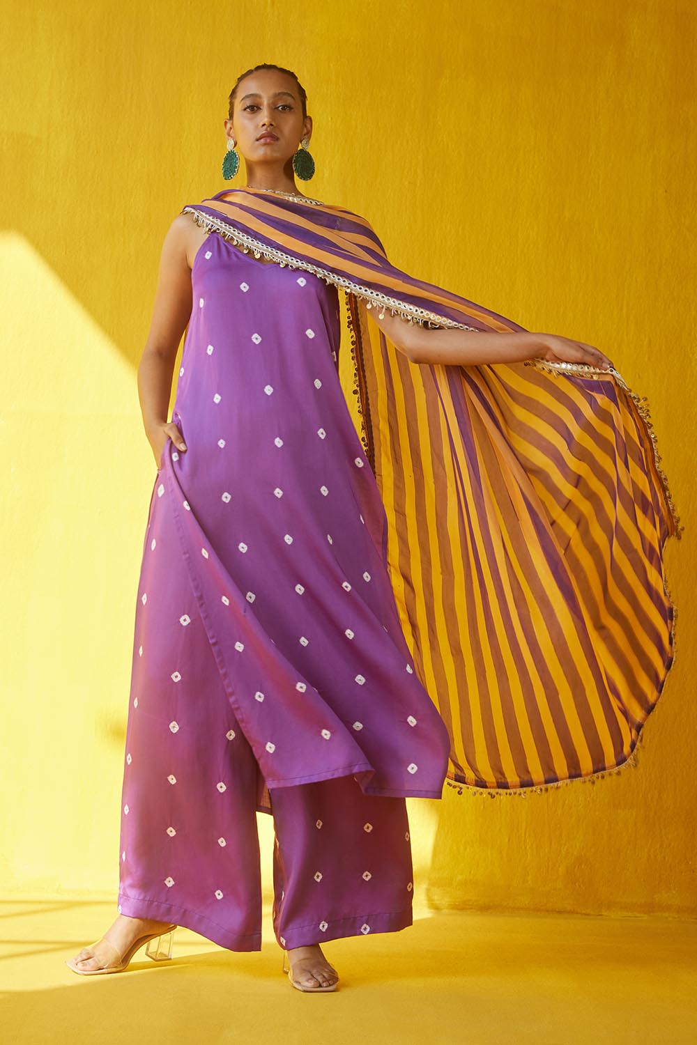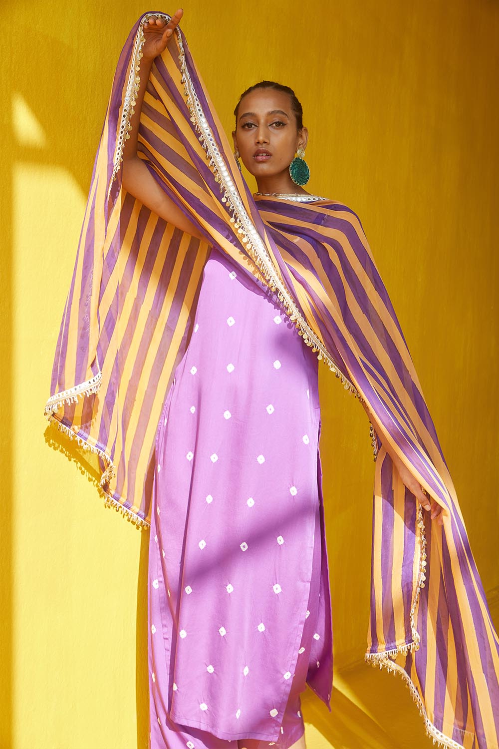 For bandhej, the fabric to be dyed is tied very tightly at different points and then dyed with extraordinary colours. These knots then don't let that part catch colour and allow it to stay as the base colour of the fabric.