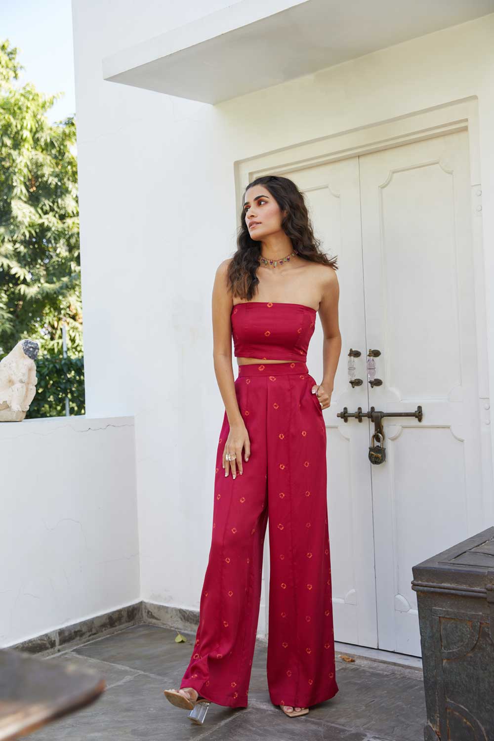 For bandhej, the fabric to be dyed is tied very tightly at different points and then dyed with extraordinary colours. These knots then don't let that part catch colour and allow it to stay as the base colour of the fabric.